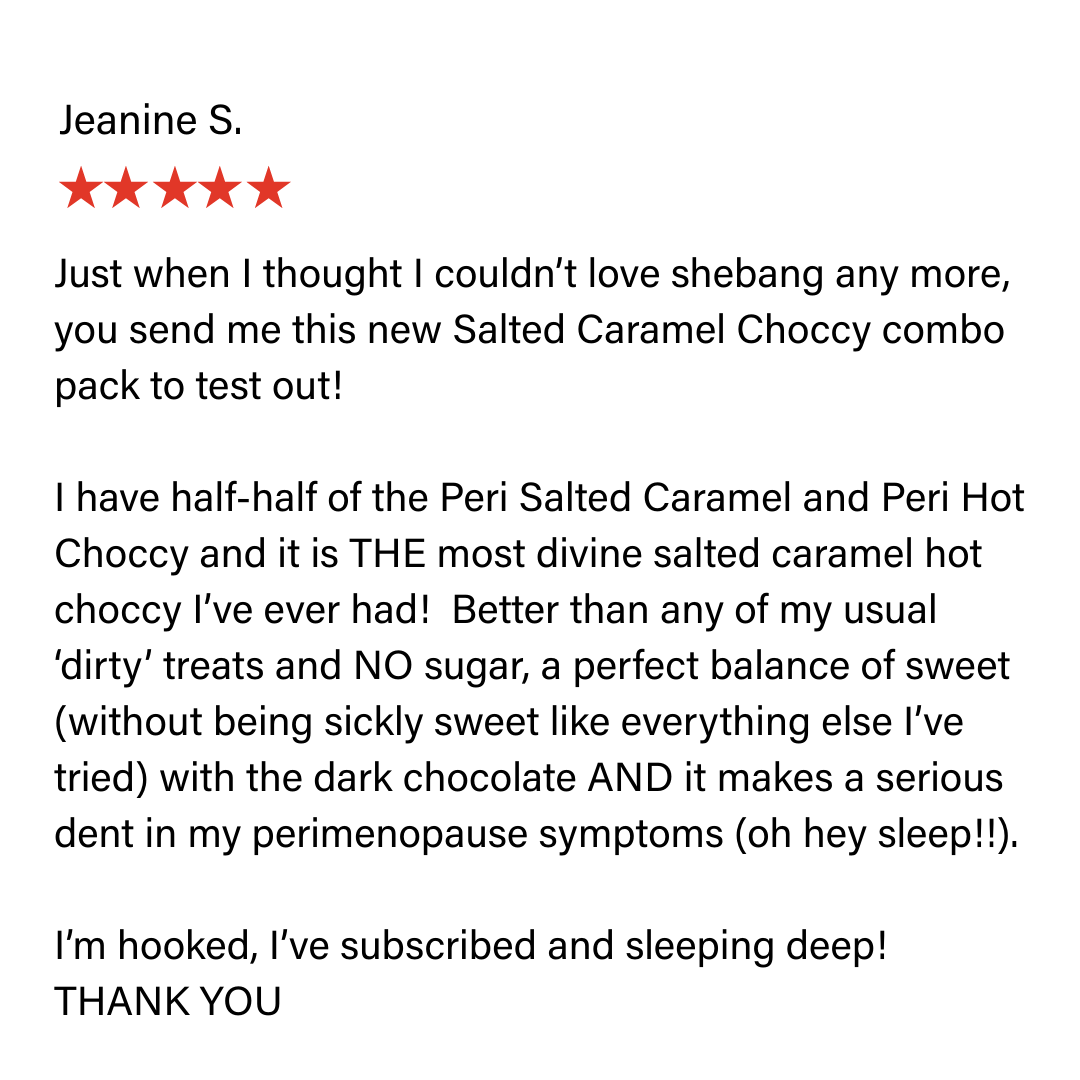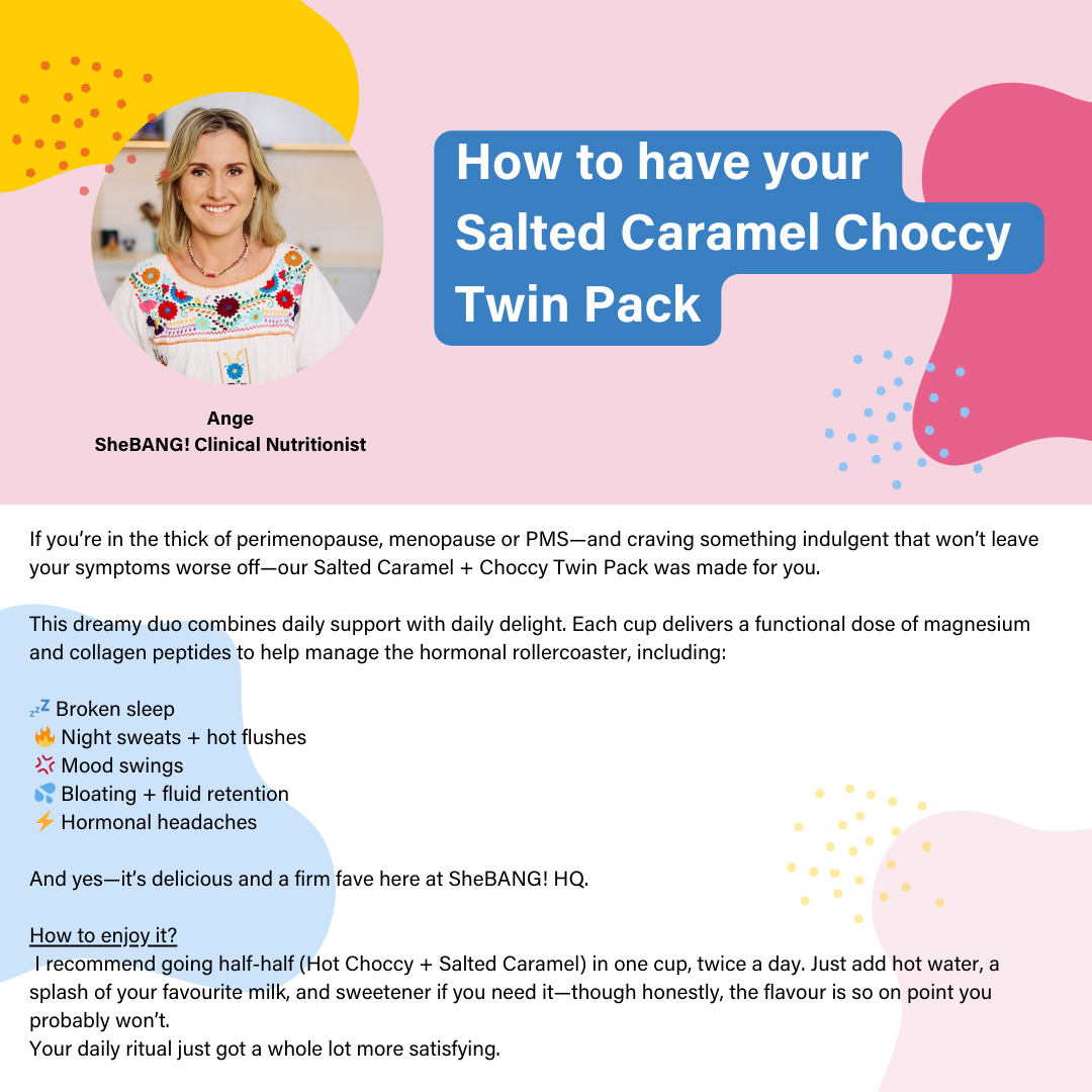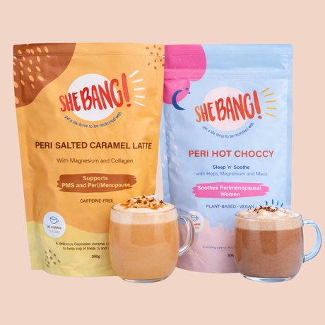 Our Peri Salted Caramel Hot Choccy Twin Pack is made for peri/menopausal women who want to feel the whole SheBANG! again but can't decide which to choose!