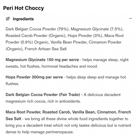 Dark Belgian Cocoa Powder (79%), Magnesium Glycinate (7.5%), Roasted Carob Powder (Organic), Hops Powder (3%), Maca Root Powder (0.9%) Organic, Vanilla Bean Powder, Cinnamon Powder (Organic), French Artisan Sea Salt