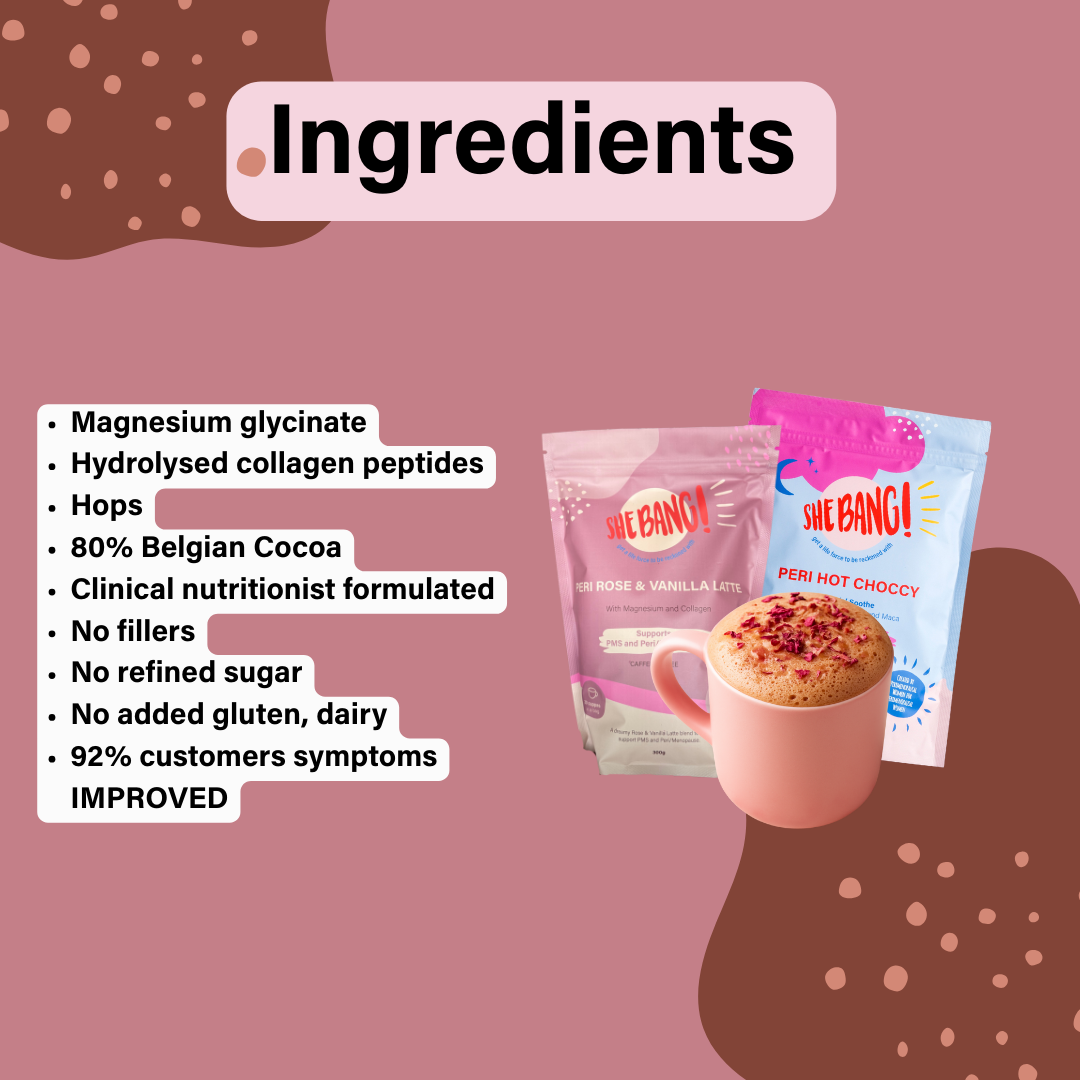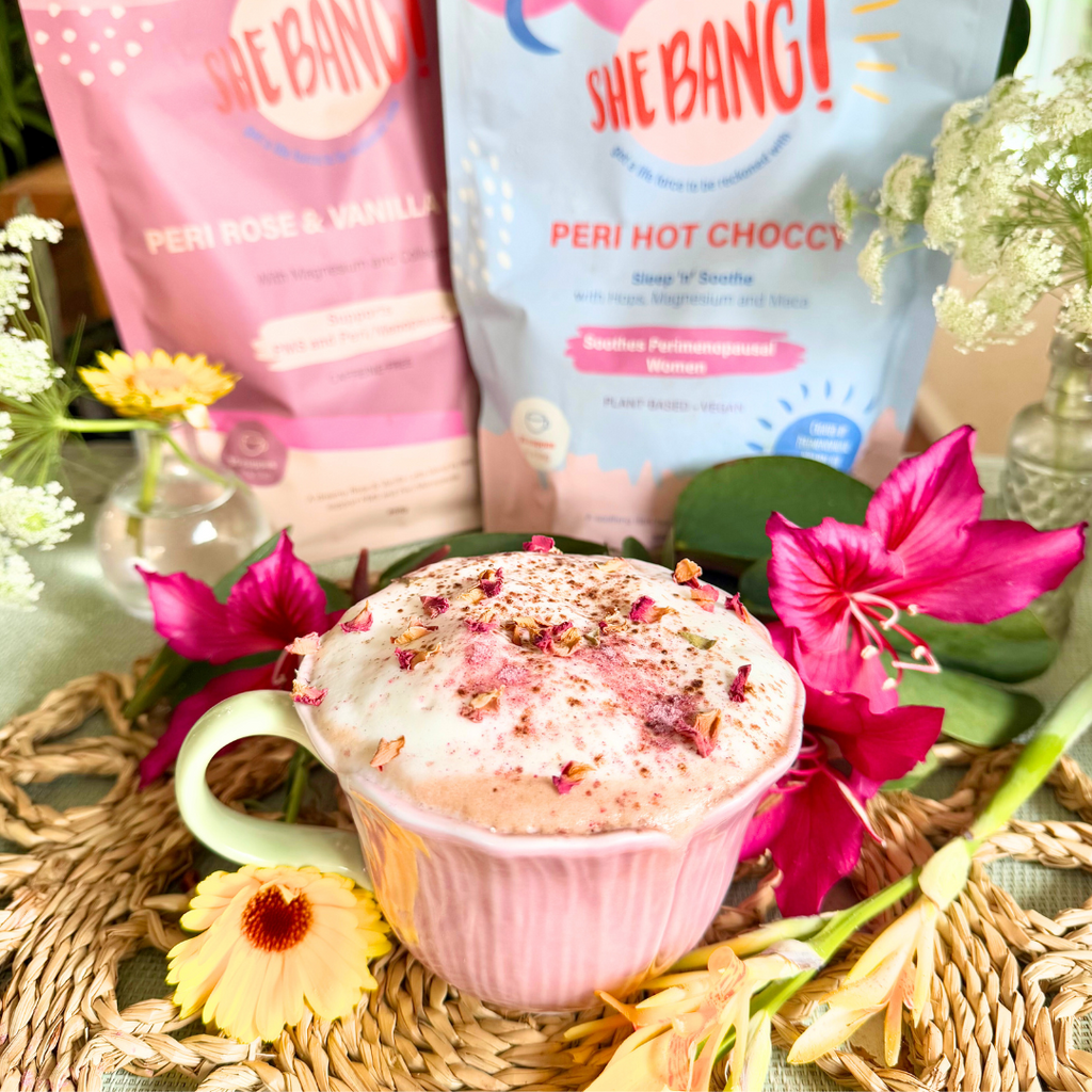 You can enjoy a SheBANG! Choccy-Rose Latte at any time of day or night to enjoy all the peri-busting benefits.