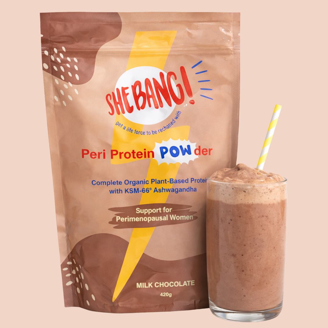 Simply add 2 heaped tablespoons (30g) of SheBANG!'s Peri Protein POWder with KSM-66 Ashwagandha to your morning smoothie to supercharge your day and help reduce perimenopause discomfort.